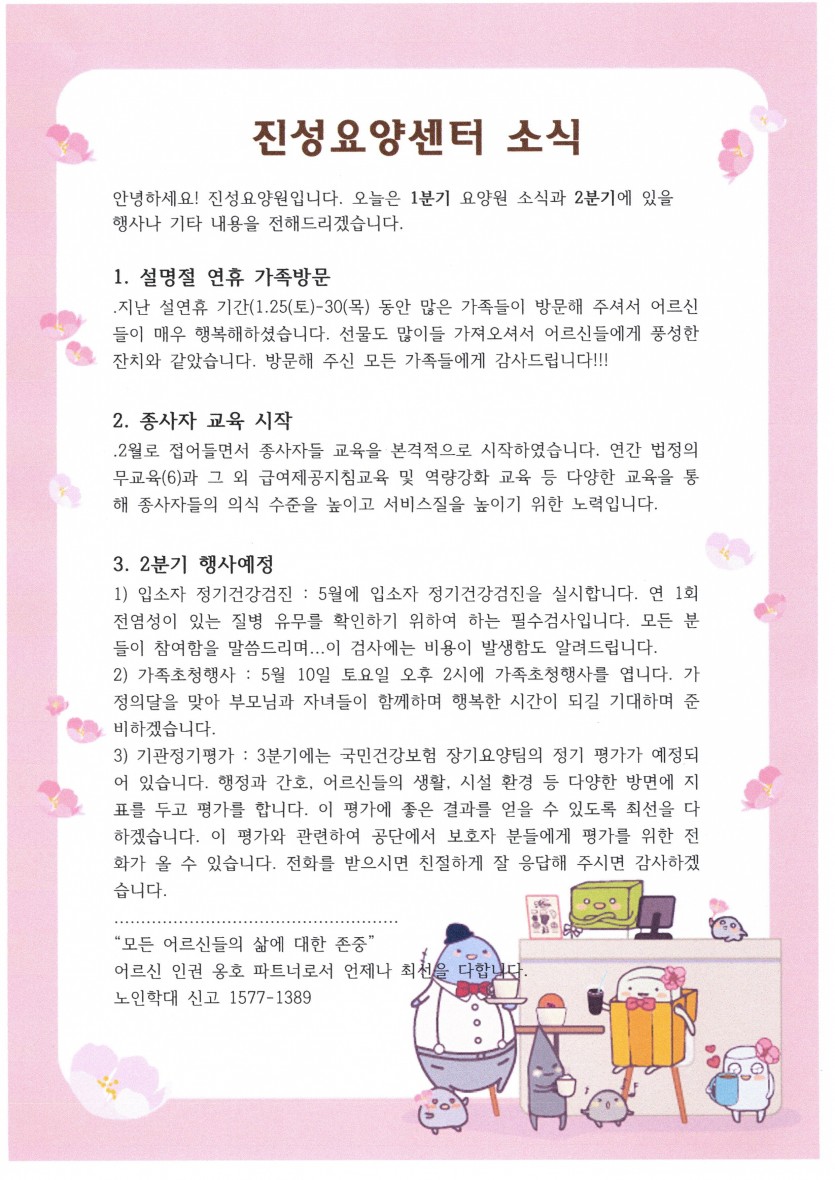 안녕하세요! 진성요양원입니다. 오늘은 1분기 요양원 소식과 2분기에 있을 행사나 기타 내용을 전해드리겠습니다.